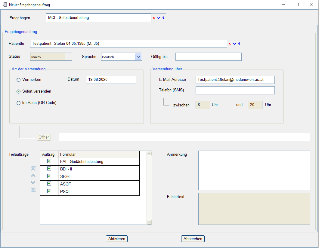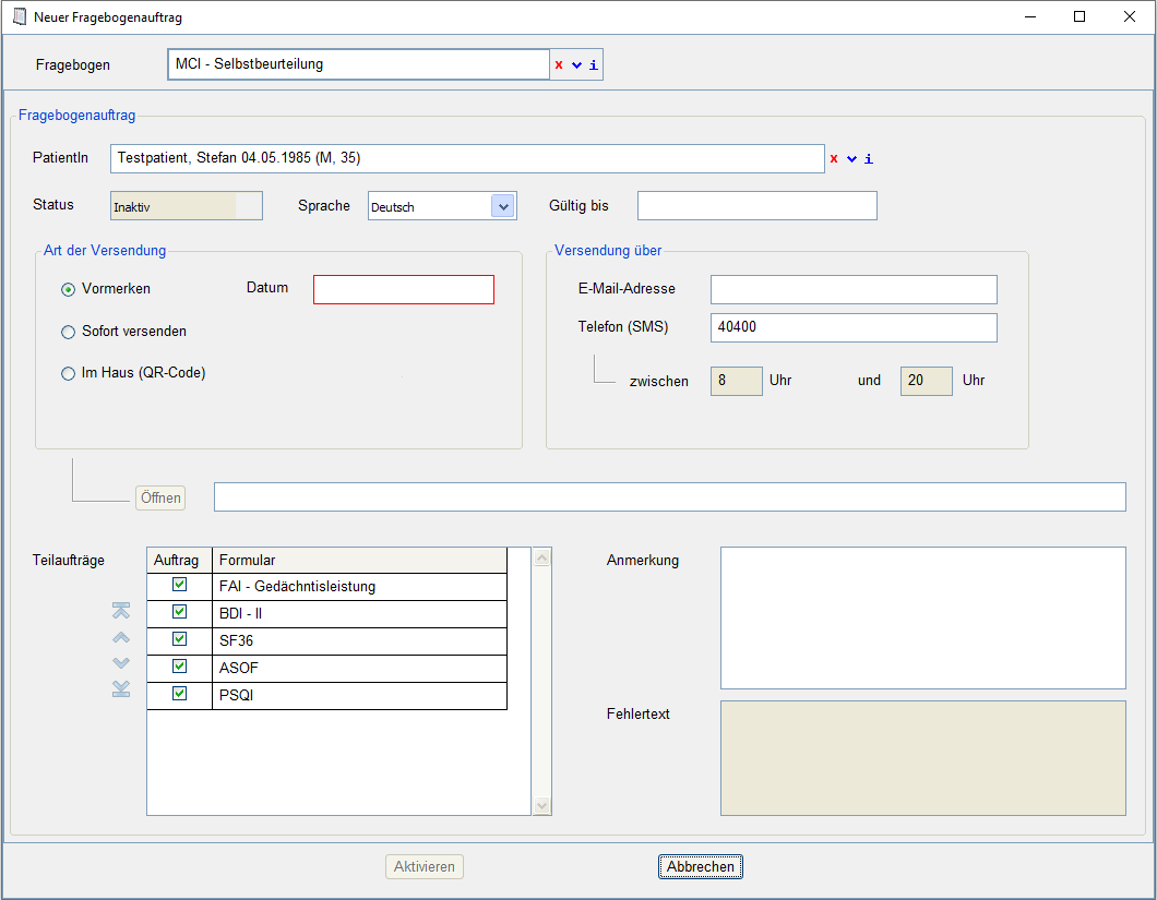 Fragebogen versenden (Vormerken)